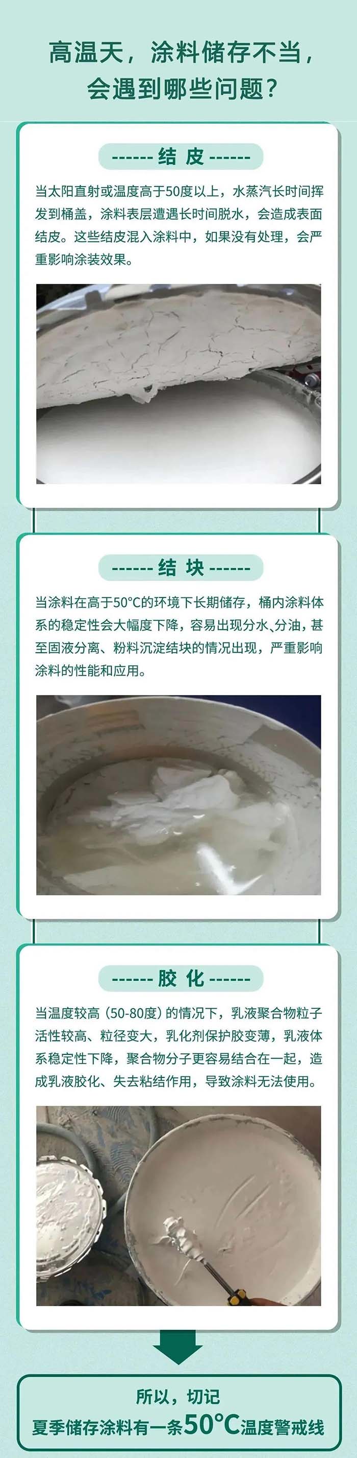 夏天的高溫天氣即將到來(lái)。水性涂料在高溫環(huán)境下儲(chǔ)存,或者遭遇長(zhǎng)時(shí)間的太陽(yáng)直曬,會(huì)導(dǎo)致桶身和桶蓋金屬材質(zhì)溫度迅速升高,使得與其接觸的涂料,特別是表層涂料出現(xiàn)結(jié)皮、結(jié)塊、膠化等現(xiàn)象,影響涂料的正常使用。