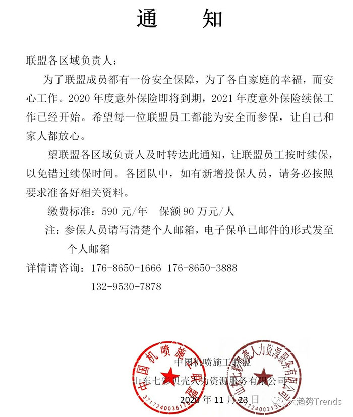 中國(guó)機(jī)噴施工聯(lián)盟2021年度保險(xiǎn)續(xù)保通知(圖文)